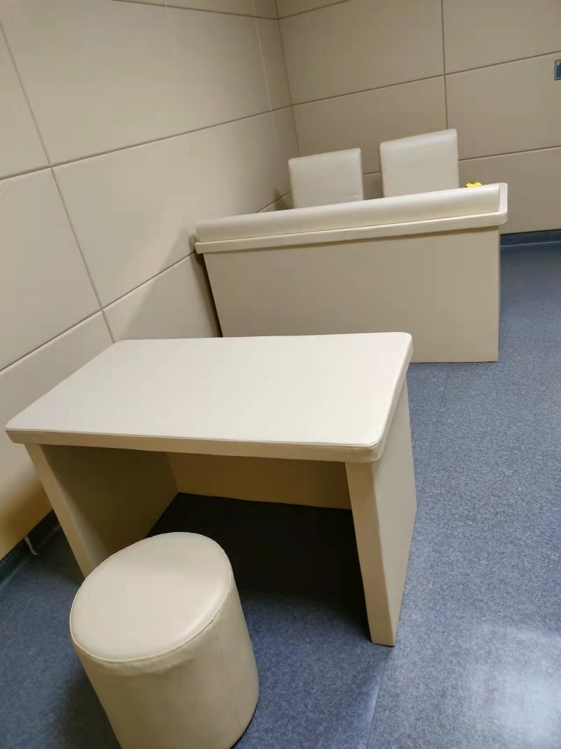 另外,谈话室还应配备防撞台面桌椅,均用新型防撞材料软包处理, 门边都须是软质条子包裹, 门把手须是