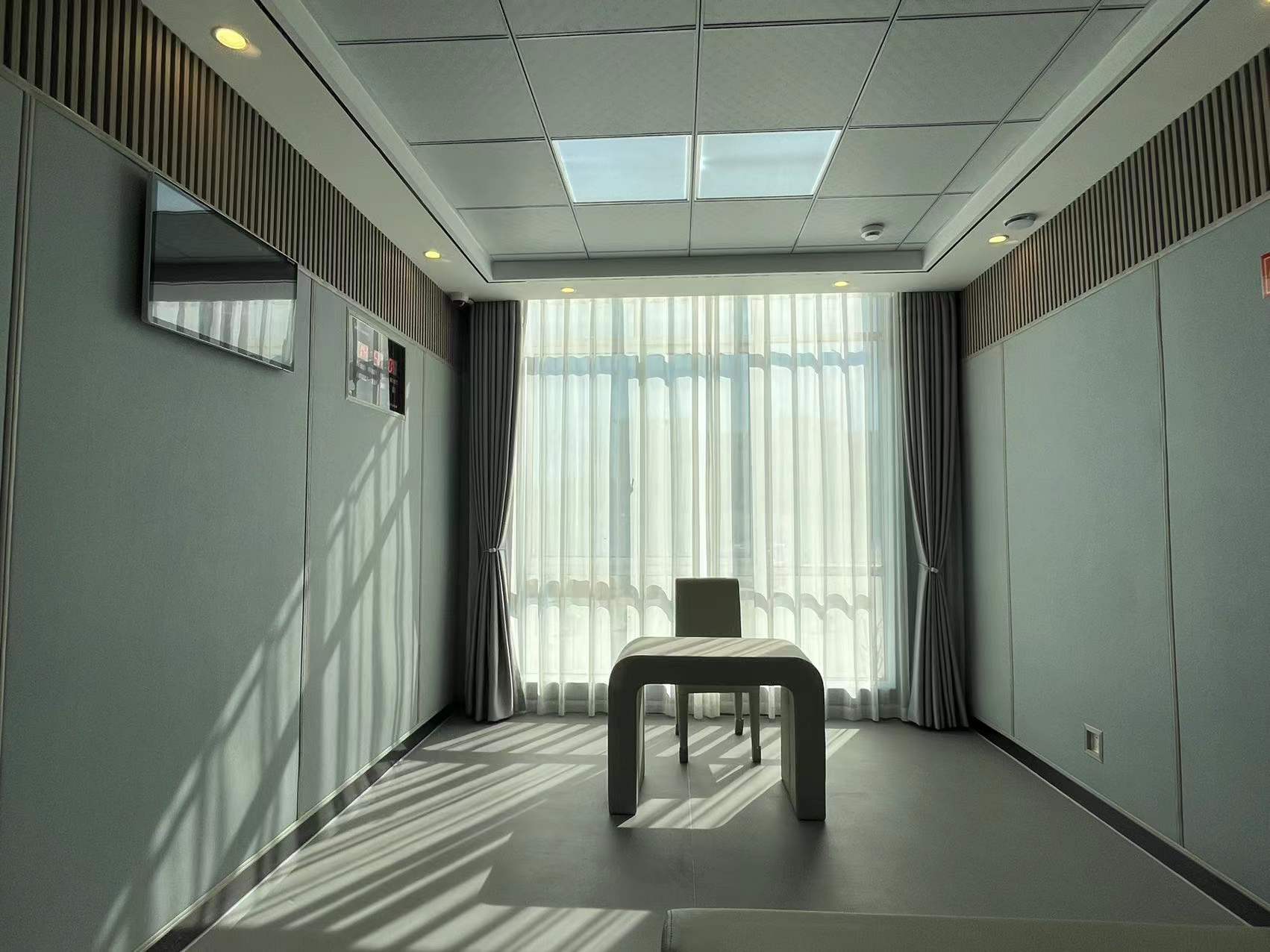 基材聚乙烯+皮革,聚乙烯棉厚度17/28mm,皮革厚度1mm大荔枝纹贴面(颜色米色/浅灰色);聚乙烯棉在皮革中采用1250*2450*20mm/1250*2450*30mm无粘多层复合新技术;审讯室软包具有防火、环保、防撞、防水、耐磨、防刮等优点,也广泛应用于国家审讯室建设、纪检制度、监督制度等。审讯室防撞软包的标准安装方案:将木工底板安装在墙面上,然后画好基线,安装好底座,软包的背面用胶刷直接安装在墙面上,压好基础线、中线等底座即可完成安装。简单易懂,普通木工即可完成,省时省力,常规两、三人即可完成安装。